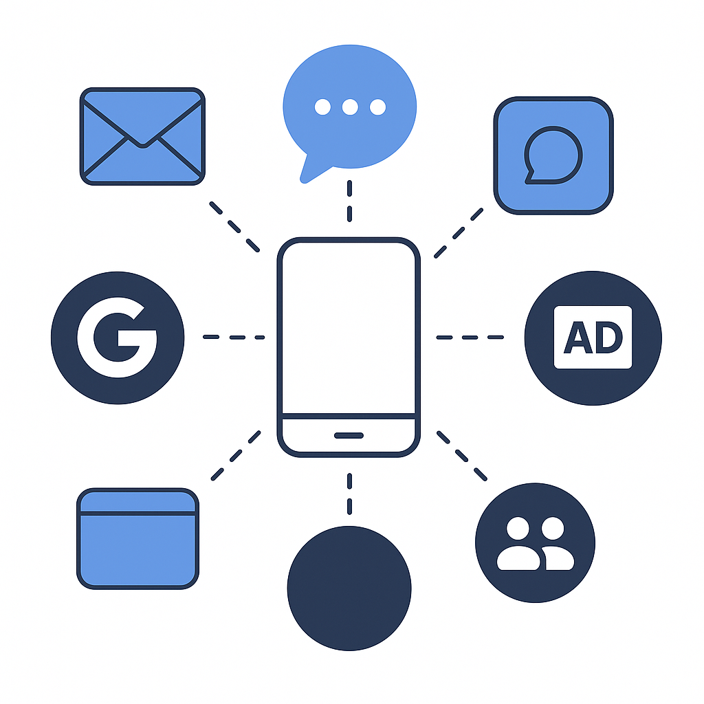 Käytössäsi ovat kaikki kanavat: Google hakusana, Google ads, Sosiaalisen median alustat, kuten Facebook, Instagram, TIktok, Snäpchat. Perinteiset mediat kuten sanoman digitaalinen verkosto